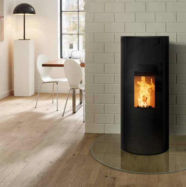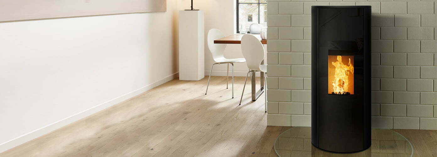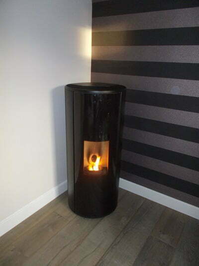 Ronde pelletkachel, met doorlopend panoramavenster.